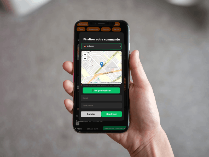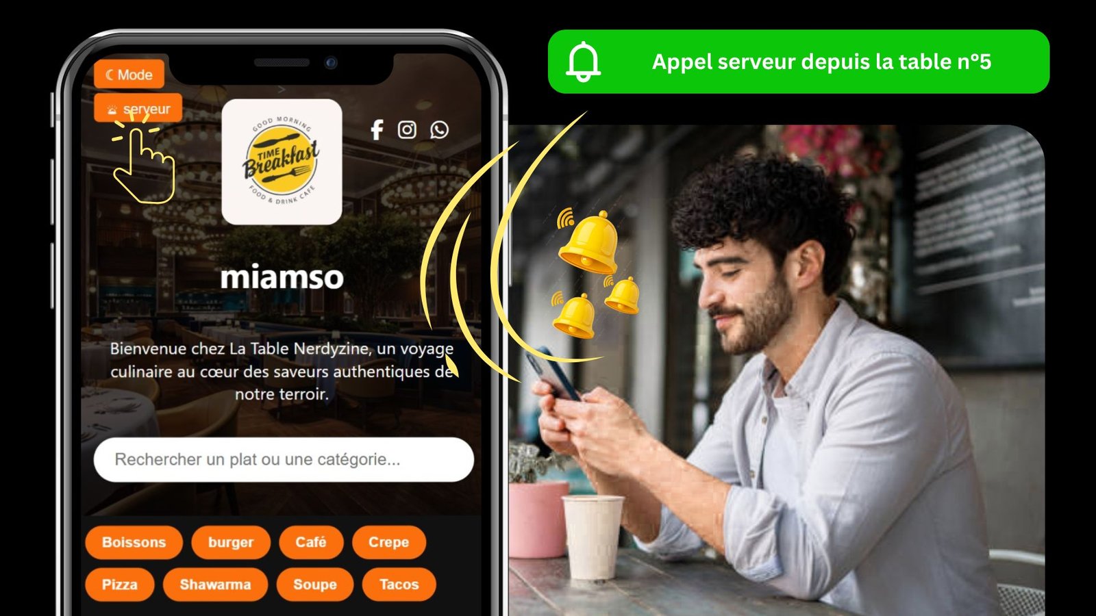 Ajout au panier, géolocalisation, ticket digital, appel serveur — vous êtes notifié.