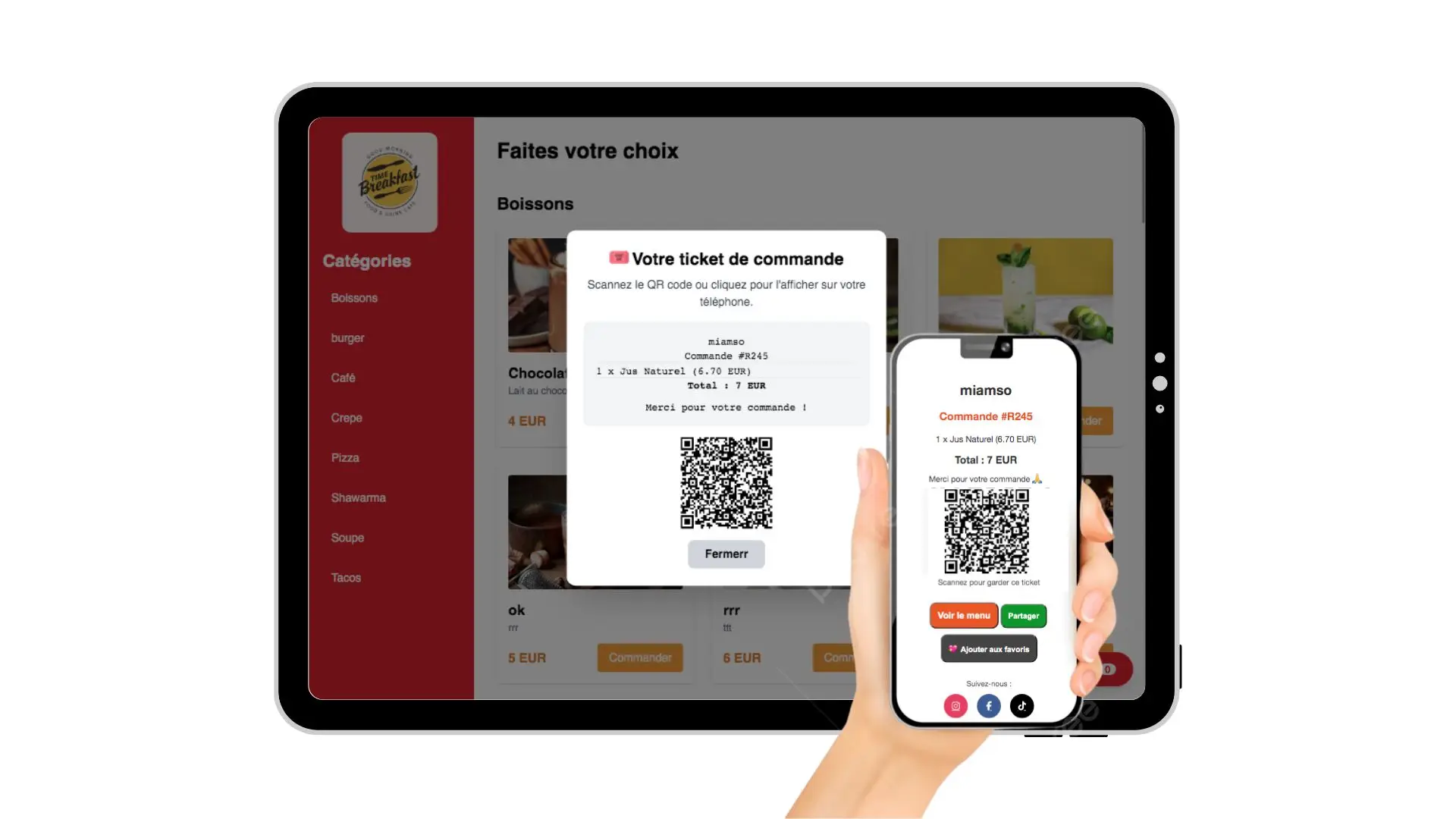 Borne tactile + ticket digital QR = prises de commande rapides, moins d’attente, plus de ventes.